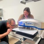 Mit dem patentierten Projektionsausrichtungssystem wird die Position der Druckvorlage bereits auf das Textil projiziert. Es vereinfacht die Ausrichtung, hilft die Produktion zu beschleunigen und Abfall durch Fehldrucke zu reduzieren. Zusätzlich lässt sich die Heizplatte der Presse einfach mittels Fußpedal zwischen den beiden Pressplatten hin- und herschicken. Wir haben nun auch verschiedengroße Austauschbodenplatten um auch schmale und kleine Gegenstände zu verzieren.